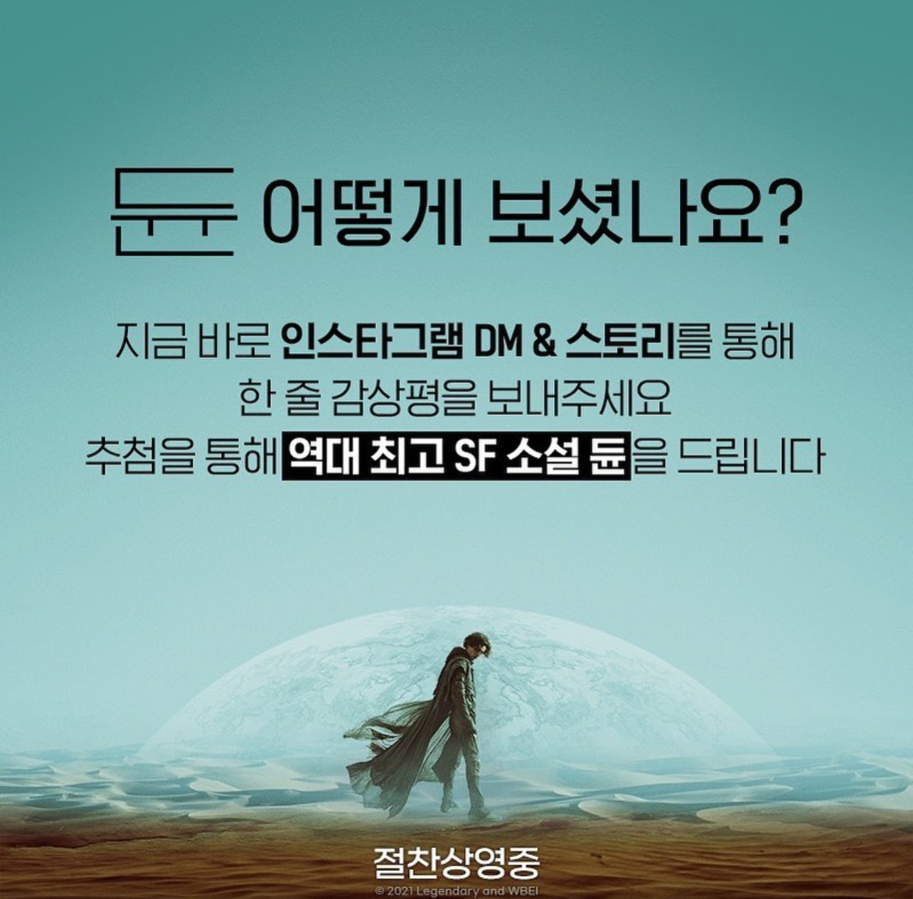 인스타그램을 통하여 워너브라더스 코리아에게 Dm 으로 스토리에대한 감상평을 보내주시면 추첨으로 듄 소설 책 1부를 드린데요!!